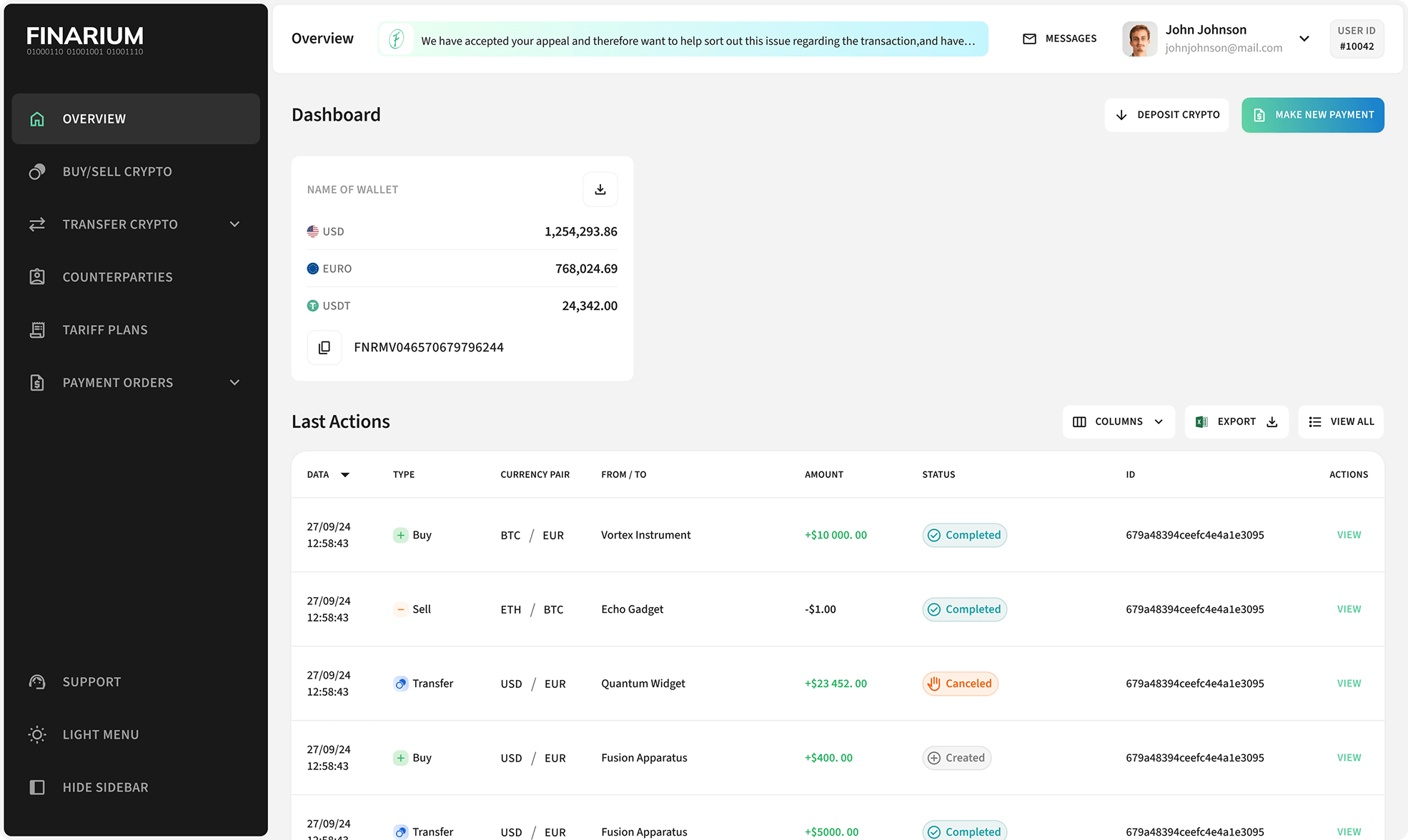 Finarium combines the impeccable, individualized service expected by corporate clients of traditional financial institutions with the advantages of modern digital asset infrastructure. Manage a wide range of cryptocurrencies, send and receive international payments, and operate through a secure and intuitive business dashboard — designed to make every transaction effortless.